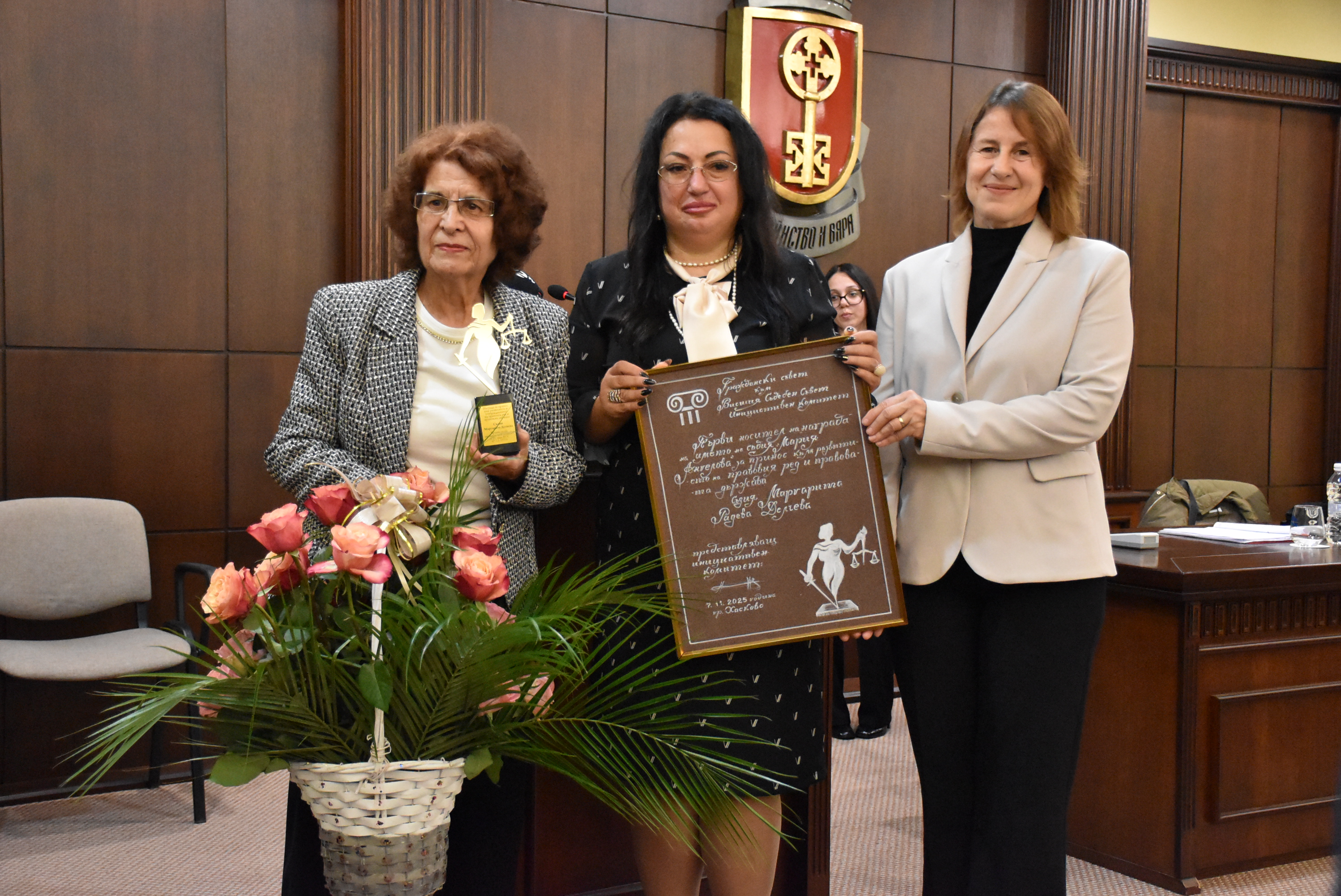 На 07.11.2025 г. от 14,00 часа в сградата на Община Хасково – Зала „Хасково“ /Общински съвет/ се състоя Първата церемония по връчване на „Награда на името на съдия Мария Ангелова за принос към развитието и утвърждаването на правовия ред и правовата държава“ – Хасково.